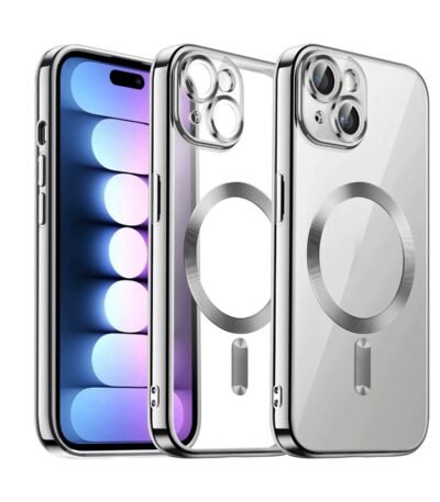 iPhone 15 Plus Uyumlu MagSafe Özellikli Gümüş Kenar Şeffaf Kılıf