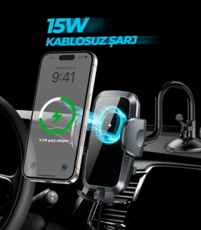 Kablosuz Şarjlı Vantuzlu Araç İçi Telefon Tutucu 15W -Vakumlu Akrobat Araba Telefon Tutacağı